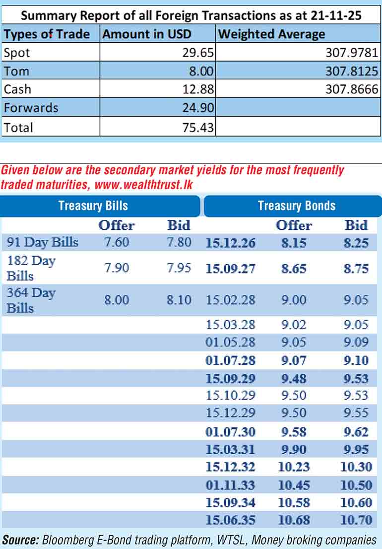 In terms of the secondary Bond market trade summary, the 01.06.26 and 15.03.28 maturities were seen trading at the rates of 8.20% and 9.02% respectively. The 01.07.30 maturity was seen trading within the range of 9.61%-9.60%. The 15.09.34 maturity was seen trading at the rate of 10.58% and the 15.06.35 maturity was seen trading within the range of 10.70%-10.69%.
