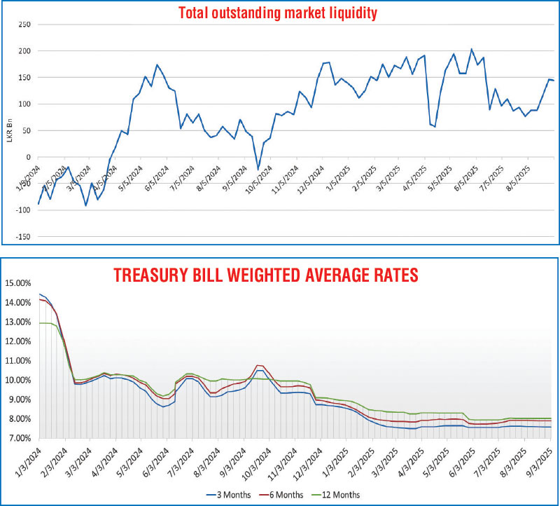 In money market, the total outstanding liquidity surplus in the inter-bank money market remained broadly steady at Rs. 144.37 billion as at the week ending 4 September 2025, from Rs. 146.54 billion recorded the previous week. The weighted average interest rates on call money and repo were recorded within the ranges of 7.85%-7.86% and 7.87% respectively while the Central Bank of Sri Lanka’s (CBSL) holding of Government Securities was registered at Rs. 2,508.92 billion as at 4 September 2025, unchanged against the previous week’s closing level.