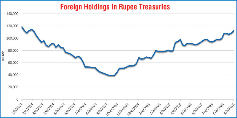 The recovery story in the foreign holdings of Rupee Treasuries continued last week. Recording a sizeable a net inflow of Rs. 3.84 billion – equivalent to a 4% week-on-week increase – during the week ending 4 September. This marked the second consecutive week of net inflows. This lifted the overall holding to Rs. 112.51 billion. Notably, this marks the highest level of foreign holdings since early February 2024.