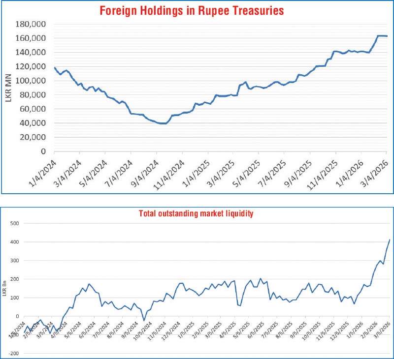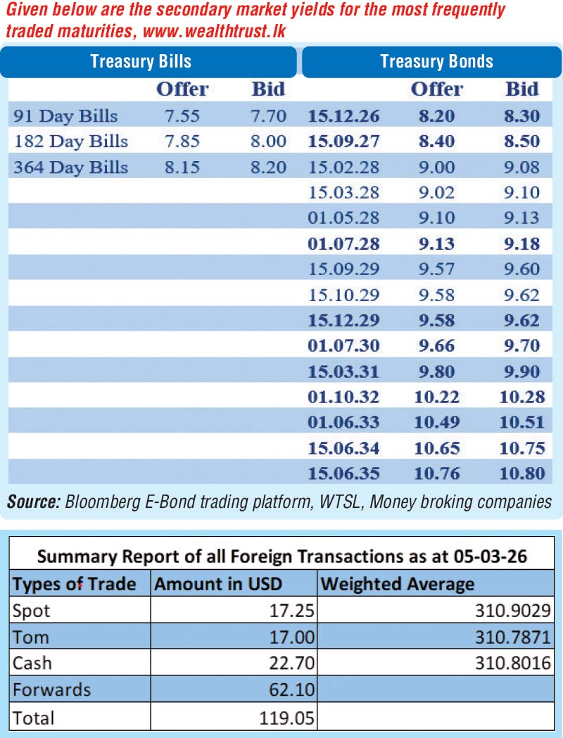 In the money market, the total outstanding liquidity surplus in the inter-bank market remained elevated and stood at Rs. 412.92 billion as at the week ending 6 March 2026, up from Rs. 358.76 billion recorded in the previous week. The Domestic Operations Department (DOD) of Central Bank continued to drain out liquidity during the week by way of overnight repo auctions at weighted average yields ranging from 7.60% to 7.51%, as well as 1 week term repo at the rate of 7.72%.