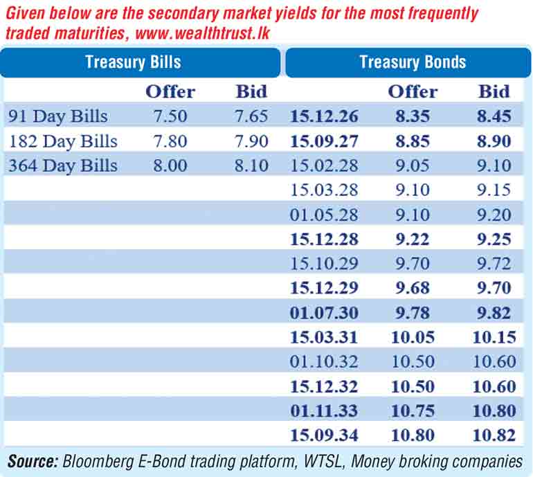 In terms of the weekly secondary Bond market trade summary, the 01.02.26 maturity was seen trading within the range of 8.00–8.05%, while the 01.06.26 changed hands at 8.25% and the 01.08.26 at 8.30%. The 15.09.27 maturity was seen trading up the range of 8.77–8.85%.