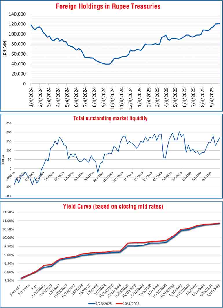 Midweek, yields climbed further, influenced by global developments. News of the US Government shutdown and the Asian Development Bank’s downward revision of Sri Lanka’s 2026 GDP growth forecast to 3.3% weighed on sentiment. However, renewed buying interest at higher yield levels provided some support, curtailing further upward movement.