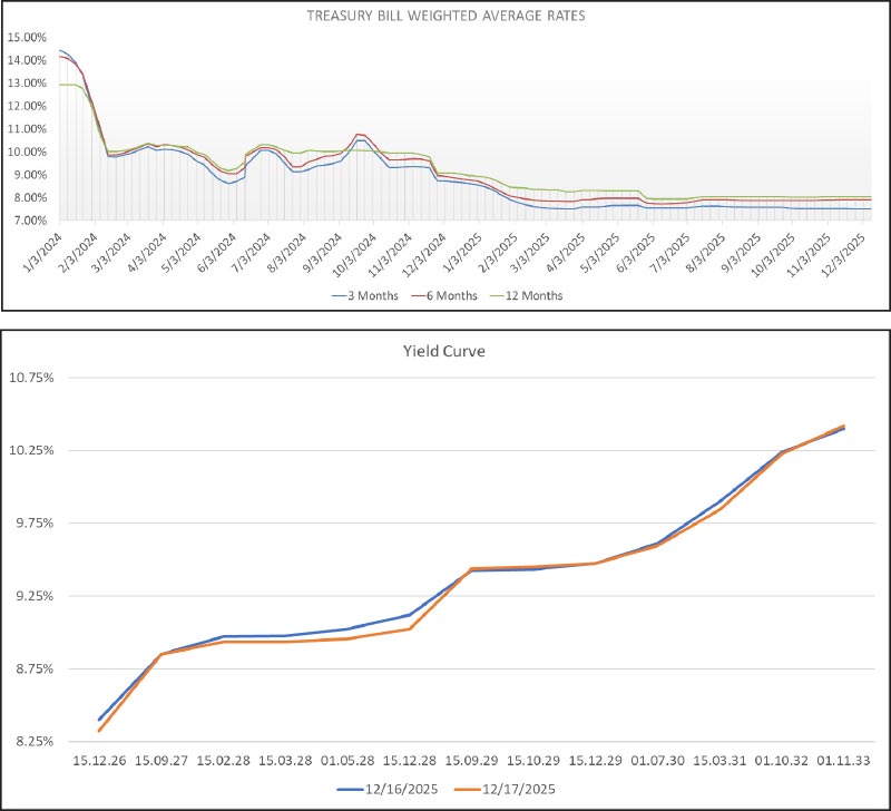 This carries forward the positive sentiment observed last week and earlier this week, driven by favourable developments including continued robust fiscal performance in Jan–Oct 2025, with the overall budget deficit narrowing by approximately 57% to Rs. 455.8 billion, supported by a strong 33% YoY increase in total revenue and grants, underpinned by a 34% expansion in tax revenue. Sentiment was further reinforced by news that the World Bank, ADB, and other multilateral lenders would provide support to bolster near-term funding capacity and foreign exchange reserves.