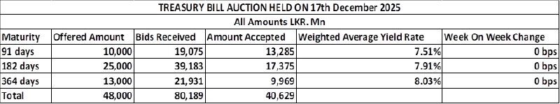Meanwhile, the weighted average rates at the weekly Treasury Bill auction conducted yesterday held steady. Accordingly, the yields on the, 91-day, the 182-day and the 364-day tenors were recorded unchanged at 7.51%, 7.91% and 8.03%. This marks the 22nd week where T-Bill rates have stayed broadly anchored around prevailing levels.