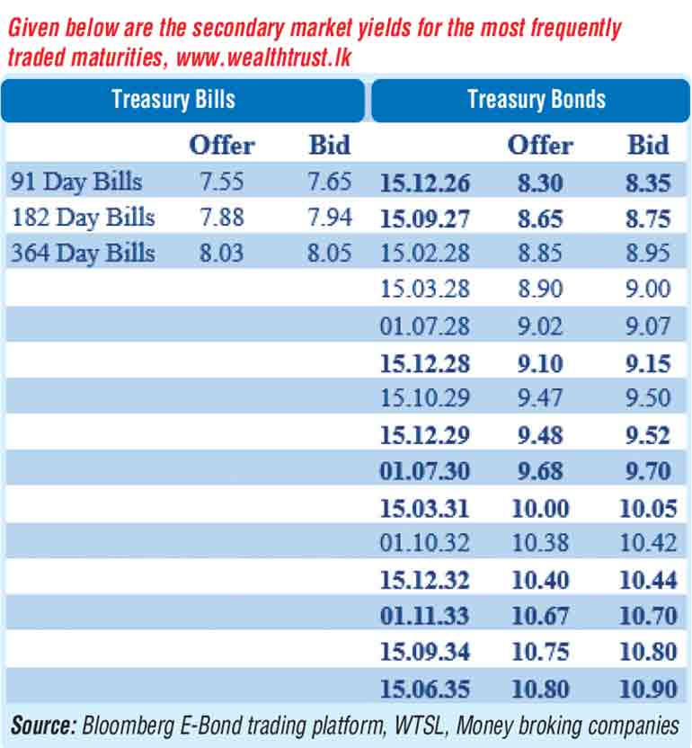 The net liquidity surplus was recorded at Rs. 140.76 billion yesterday. An amount of Rs. 8.04 billion was withdrawn from the Central Bank’s SLFR (Standing Lending Facility Rate) of 8.25%, while an amount of Rs. 148.80 billion was deposited at Central Bank’s SDFR (Standard Deposit Facility Rate) of 7.25%.