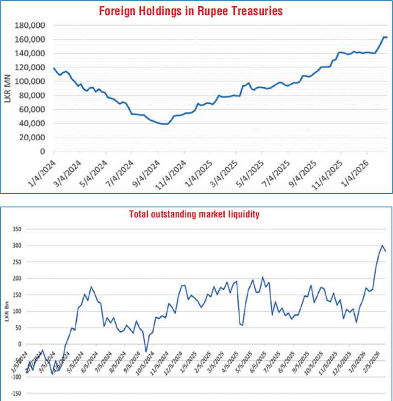 In the money market, the total outstanding liquidity surplus in the inter-bank market stood at Rs. 283.22 billion as at the week ending 20 February 2026, down from Rs. 299.68 billion recorded in the previous week. The Domestic Operations Department (DOD) of the Central Bank continued to drain out liquidity during the week by way of overnight repo auctions at weighted average yields ranging from 7.63% to 7.65%.
