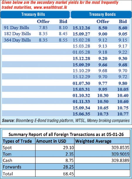 For context, at the weekly Treasury Bill auction held last Wednesday (31 December), weighted average yields recorded an upwards movement across the board for a second consecutive week. Accordingly, the weighted average yield on the 91-day Bill rose by 19 basis points to 7.74%, the 182-day by 32 basis points to 8.27%, and the 364-day by 26 basis points to 8.45% respectively. Total funds raised amounted to Rs. 57.39 billion against an offered amount of Rs. 120 billion, translating to a 47.83% subscription ratio.