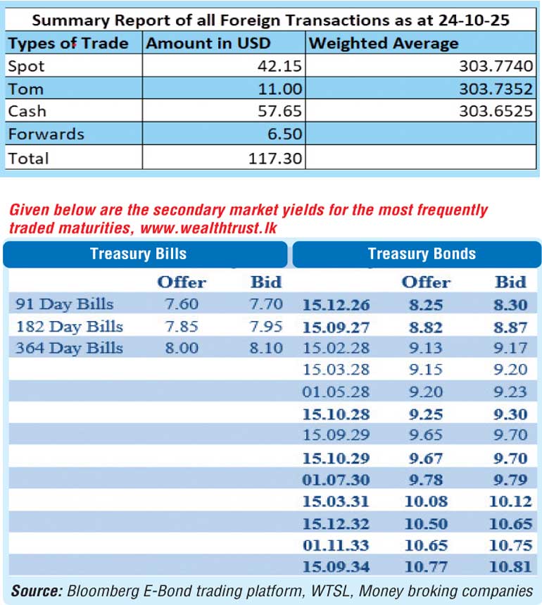 In the Forex market, the USD/LKR rate on spot contracts closed the day depreciating further to Rs. 304.10/304.25 as against Rs. 303.70/303.85 the previous day.