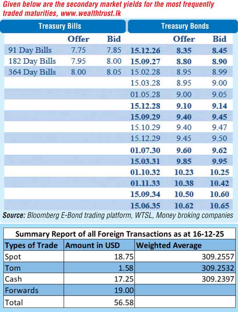 For context, at the previous weekly Treasury Bill auction held last Wednesday (10 December) the weighted average yields remained unchanged. Accordingly, the 91-day, 182-day and 364-day tenors were recorded at 7.51%, 7.91% and 8.03%, respectively. This marks the 21st consecutive week in which Treasury Bill yields have remained broadly anchored at prevailing levels. The auction was fully subscribed, with the entire Rs. 48 billion on offer successfully raised. Notably, this represents the first full subscription in six consecutive auctions. Total bids received amounted to 2.19 times the accepted amount, reflecting healthy investor demand.