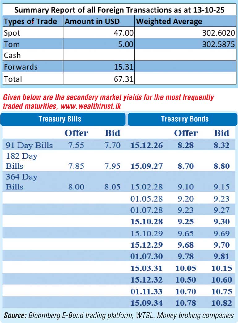 The total secondary market Treasury Bond/Bill transacted volume for 13 October was Rs. 37 billion.
