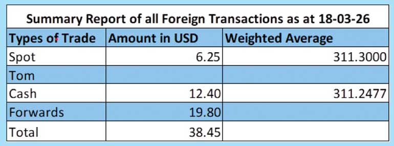 The total USD/LKR traded volume for 18 March was Rs. 38.45 million.