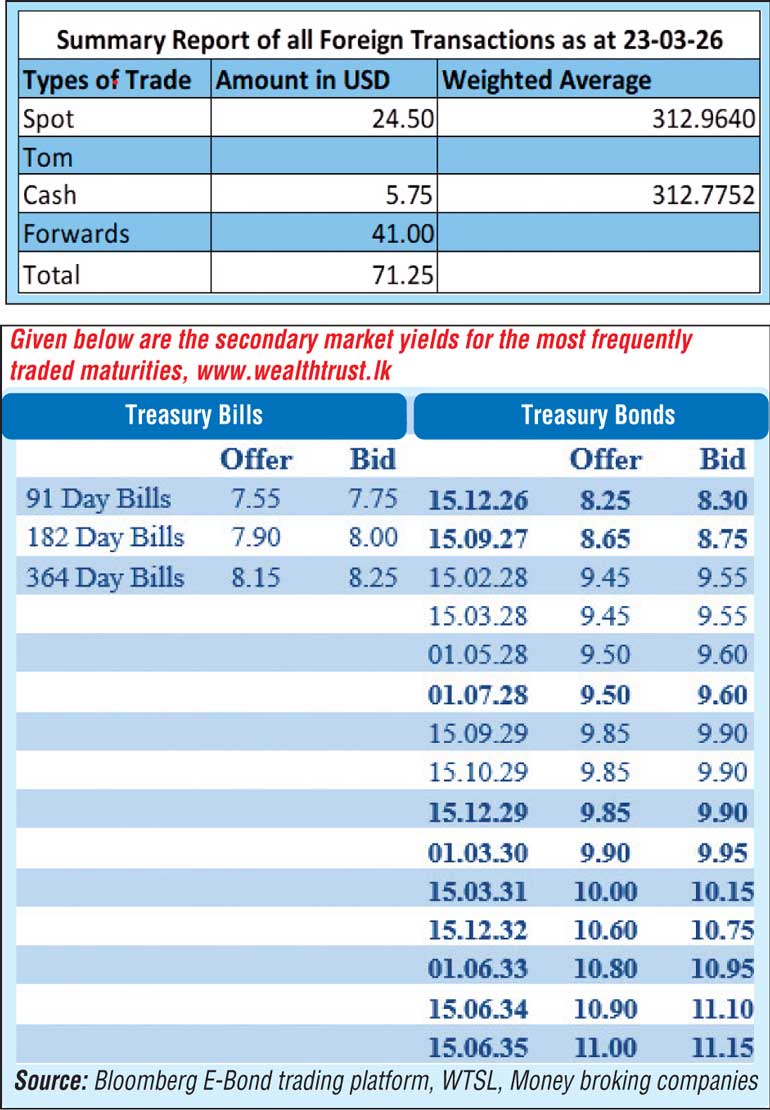 Secondary market Bond yields yesterday initially traded downward, responding to a sharp softening in global oil prices. This followed news that the US had postponed planned strikes on Iranian energy infrastructure for five days, alongside indications of constructive diplomatic engagement, which temporarily eased geopolitical concerns.