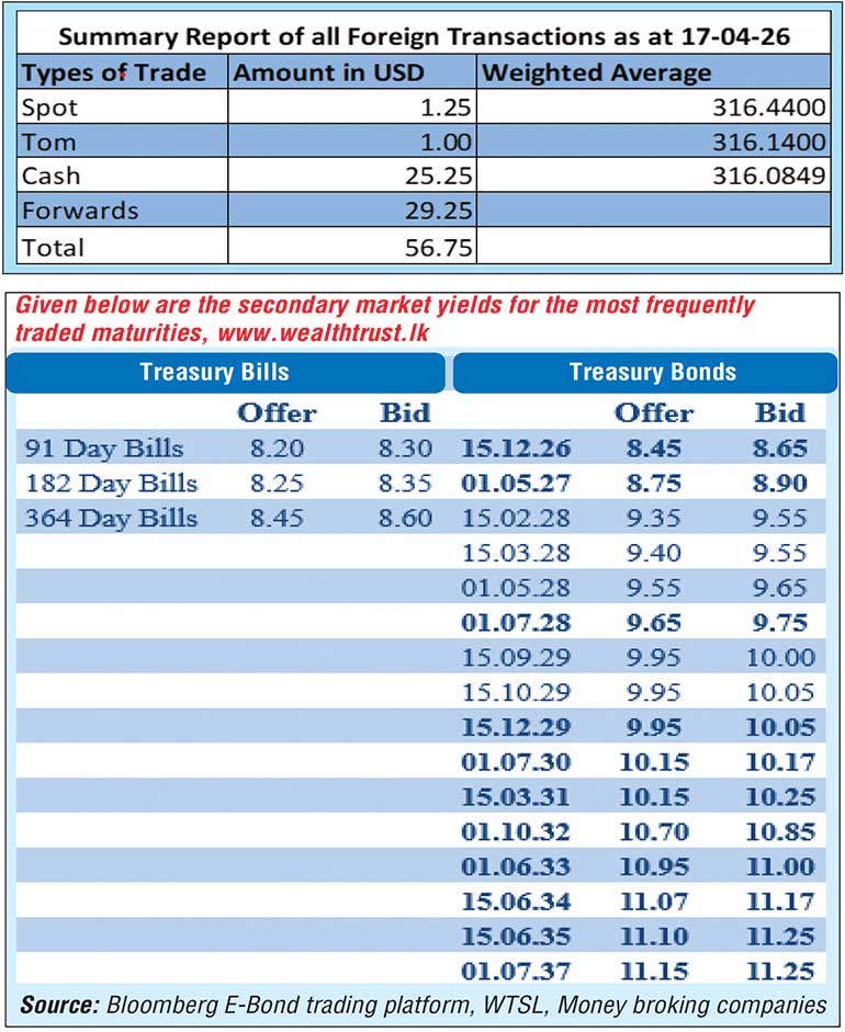 The total secondary market Treasury Bond/Bill transacted volume for 17 April was Rs. 9.50 billion.