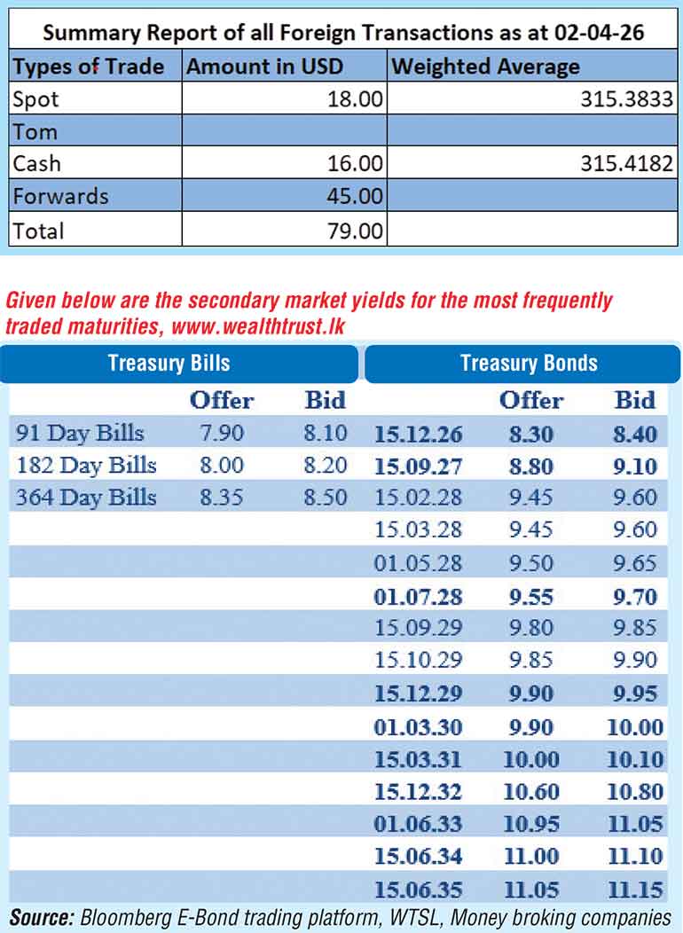 Rs. 315.35/315.40. The total USD/LKR traded volume for 2 April was $ 79.00 million.