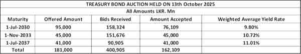 The Treasury Bond auctions held yesterday with a total offered amount of Rs. 181 billion across three available maturities, went undersubscribed. The auctions raised only Rs. 162.11 billion or 89.56% out of the total offered amount in successful bids across both phases, despite total bids received exceeding the offered amount by 2.21 times.