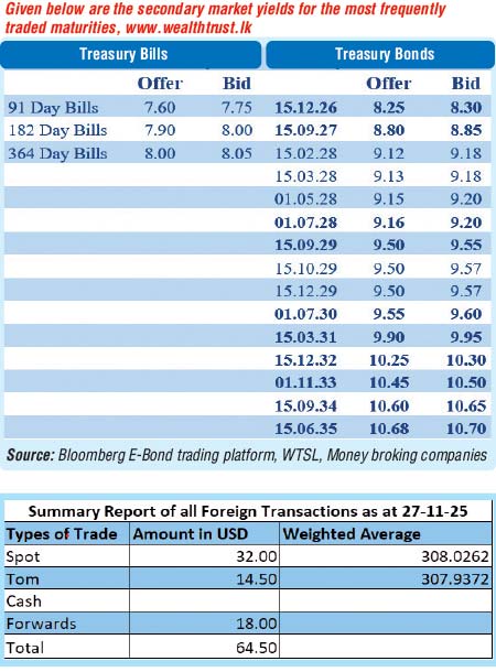 At the weekly Treasury Bill auction held last Wednesday (26 November) the weighted average rates at the weekly Treasury Bill auction conducted remained unchanged across the board. Accordingly, the yields on the 91-day, the 182-day and the 364-day tenors were recorded at 7.52%, 7.91% and 8.03%. This marks the 19th week where T-Bill rates have stayed broadly anchored around prevailing levels. However, the auction was undersubscribed, raising only 64.32% or Rs. 55.637 billion out of the Rs. 86.50 billion offered. This marks the fourth consecutive auction to undersubscribed, despite the bids received to offered amount ratio being recorded at 1.44 times.