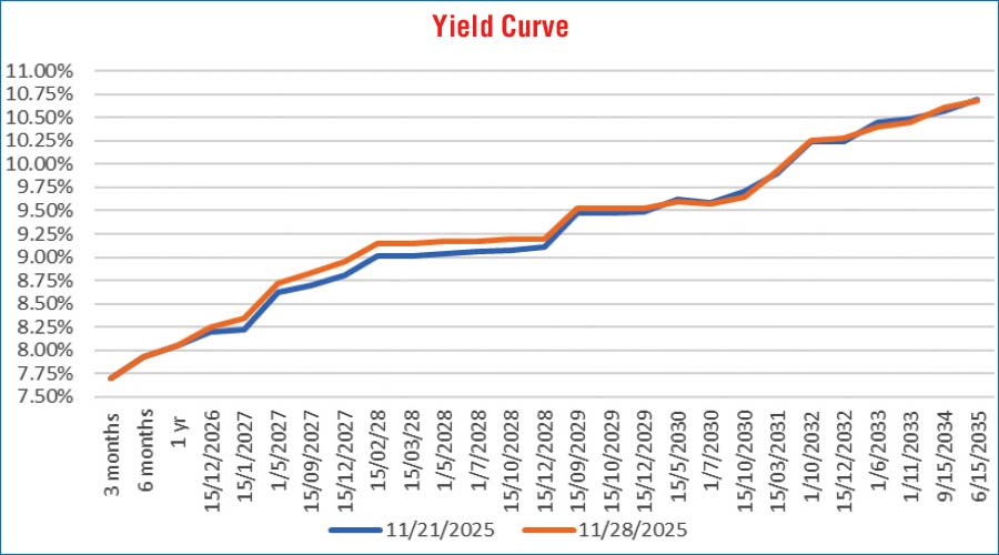 Subsequently, on Thursday after the outcome of the Treasury Bond auction, where rates came in below market expectations, the market continued to consolidate. On Friday, at the tail end of the week, as the effects of Cyclone Ditwah rocked Sri Lanka with adverse weather, market activity was seen at subdued levels and yields on the shorter tenors edged up further, while the long end held firm.