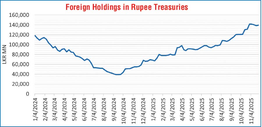 The foreign holdings of rupee-denominated Government securities resumed its upward trajectory recording a net inflow amounting to Rs. 1 billion as at the close of the week ending 27 November, a 1% increase week on week. As a result, the total holdings rose to Rs. 139.53 billion. This comes against the backdrop of increased expectations of a further US FED rate cut due in December, with the CME FedWatch tool showing an 86.40% probability of a further 25 basis points cut.