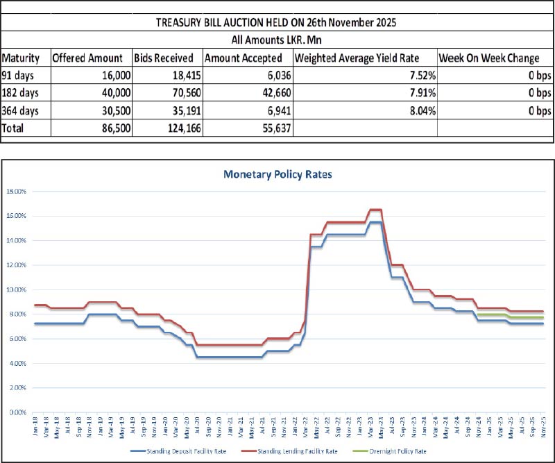 For context, the previous Treasury Bond auctions held on 13 November, with a total offered amount of Rs. 80 billion across two available maturities, was fully subscribed at the first phase in competitive bidding. Total bids received exceeded the offered amount by 2.73 times. This marked the first instance in 7 consecutive bond auctions to raise the entire offered amount.