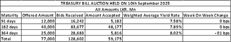 For context, the previous round of Treasury Bond auctions held on 12 August with a total offered amount of Rs. 65 billion across two available maturities, went undersubscribed. The auctions raised only Rs. 18.53 billion or 28.51% out of the total offered amount in successful bids across both phases, despite total bids received exceeding the offered amount by 2.06 times. This marked the fourth consecutive bond auction to raise less than the offered amount. Maturity-wise the results were as follows: