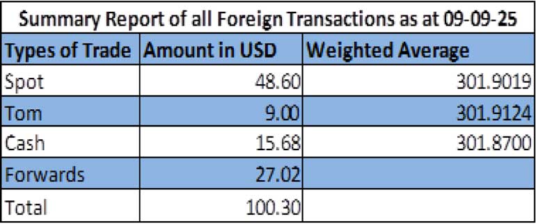 The total USD/LKR traded volume for 09 September was $ 100.30 million.