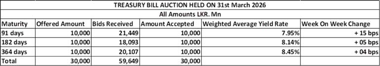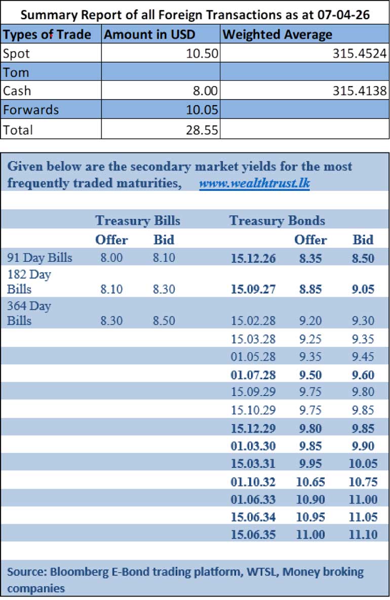 This comes ahead of the Treasury Bond auctions scheduled to be conducted today, 9 April. The round of auctions will have a total offered amount of Rs. 100.00 billion across three available maturities.