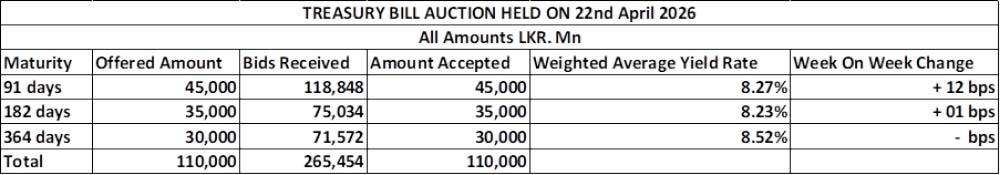 At the weekly Treasury Bill auction conducted yesterday, the weighted average increased notably only on the shorter tenor 91-day maturity, breaking a trend of 4 weeks, of across-the-board increases. Accordingly, the yield on the 91-day Bill rose by 12 basis points to 8.27% and the 182-day Bill increased by only one basis point to 8.23%. However, the 364-day Bill saw its weighted averages remain unchanged at 8.52%.