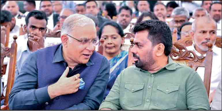 Indian High Commissioner Santosh Jha (left) shares a moment with President Anura Kumara Disanayake at event in Bandarawela to distribute land deeds to plantation families under an India-funded housing project