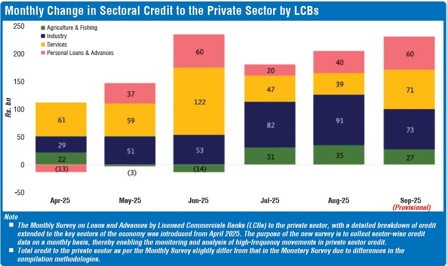 The sectoral figures come from the Central Bank of Sri Lanka’s (CBSL) Monthly Survey on Loans and Advances by Licenced Commercial Banks to the private sector. Introduced from April 2025, the survey tracks the monthly change in outstanding credit to four categories: agriculture and fishing, industry, services, and personal loans and advances.