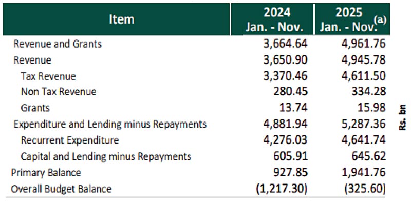 The Government’s fiscal performance continued to strengthen before the Ditwah crisis, with the Budget deficit in the 11 months to end-November 2025 contracting by over 73% from a year ago and the record primary surplus nearing Rs. 2 trillion.