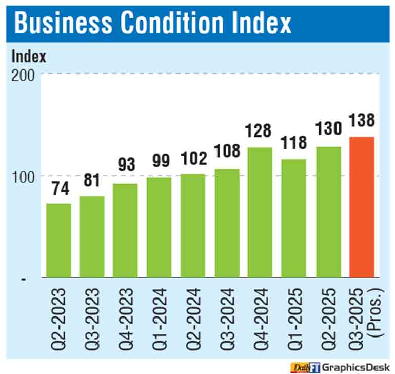 The Central Bank of Sri Lanka (CBSL) recently said its Business Outlook Survey (BOS) Business Condition Index rose to 130 in 2Q 2025, the highest since falling to a low 28 in the 2Q 2022, which would extend further to 138 in 3Q 2025.