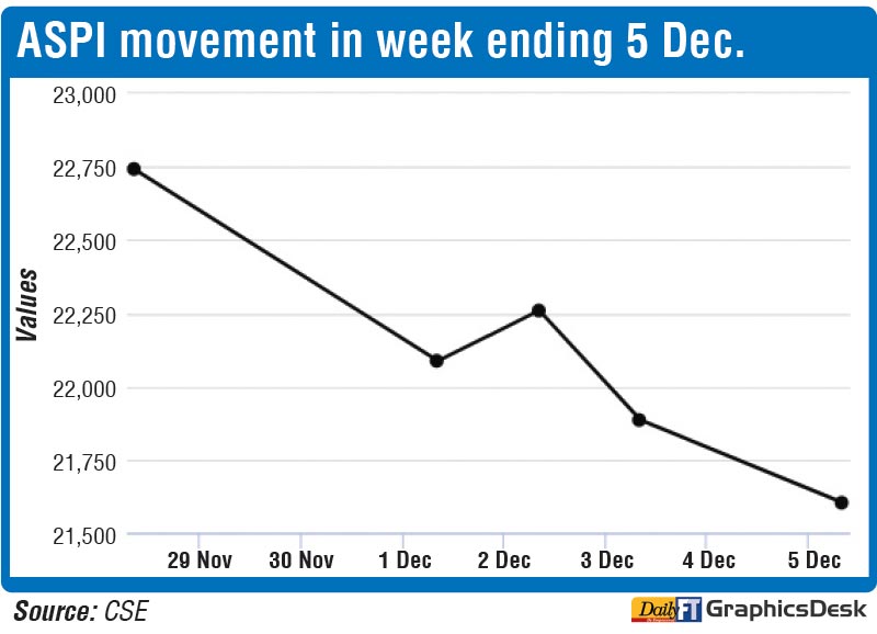 Week on week, the ASPI was down 5.35% or 1,215.74 points and the active S&P SL20 was down 5.45% or 341.4 points.
