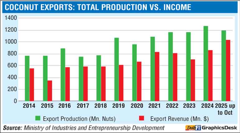 The country’s coconut sector has recorded a landmark year in 2025, with export earnings surpassing $ 1 billion and projected to reach around $ 1.2 billion by year-end, Industry and Entrepreneurship Development Deputy Minister Chathuranga Abeysinghe yesterday said, highlighting the industry’s growing importance in the country’s export basket.