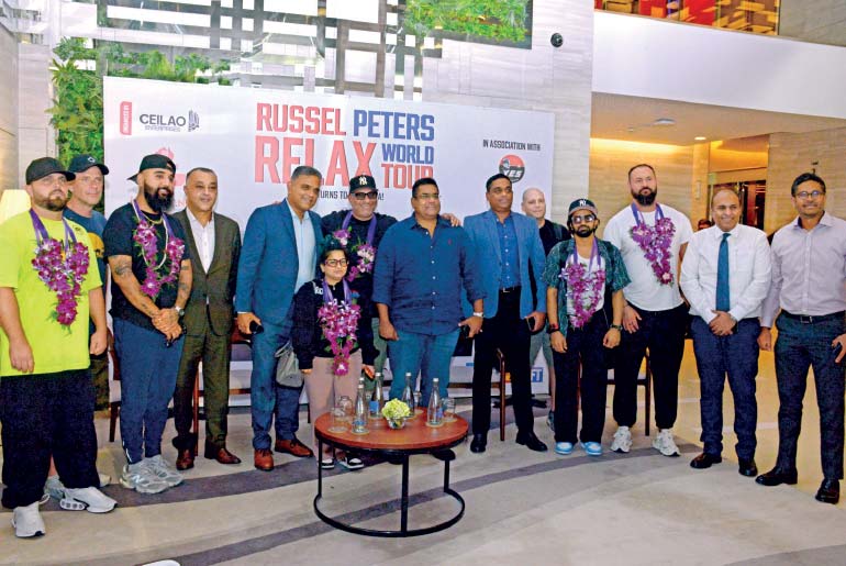 Word famous comedian Russell Peters, who arrived yesterday to perform in Colombo tonight at Cinnamon Life at City of Dreams as part of his ‘Relax’ World Tour, poses with some of his staff and event partners. Show organiser Australian Migration Consultants Chairman Dr. Manjula Kulatunga, Cinnamon Hotels & Resorts Colombo Hotels Senior Vice President and Cinnamon Life at City of Dreams General Manager Kamal Munasinghe, City of Dreams Sri Lanka Vice President and Property General Manager Michael Habashi, and MBC Networks CEO Buddhi Wickramanayake are also present