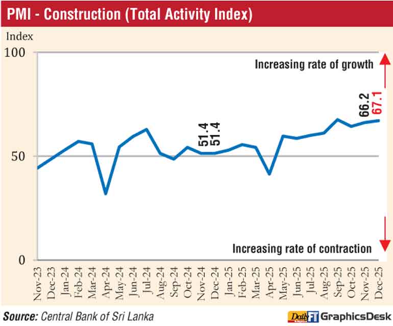 Sri Lanka’s construction sector recorded a further expansion in December 2025, with the Purchasing Managers’ Index for Construction (PMI – Construction) rising to 67.1 from 66.2 in November, according to the Central Bank of Sri Lanka (CBSL).