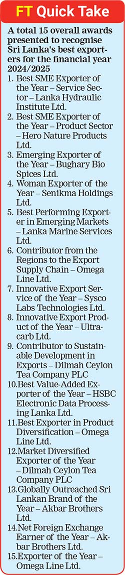 The prestigious awards, considered the highest national accolade for export excellence, recognised companies that made outstanding contributions to Sri Lanka’s economic growth during the 2024/2025 financial year. This year’s ceremony conferred 107 awards across two major categories—15 overall awards and 92 sectoral awards—alongside merit awards determined by a panel of judges based on applicants’ performance and industry impact.