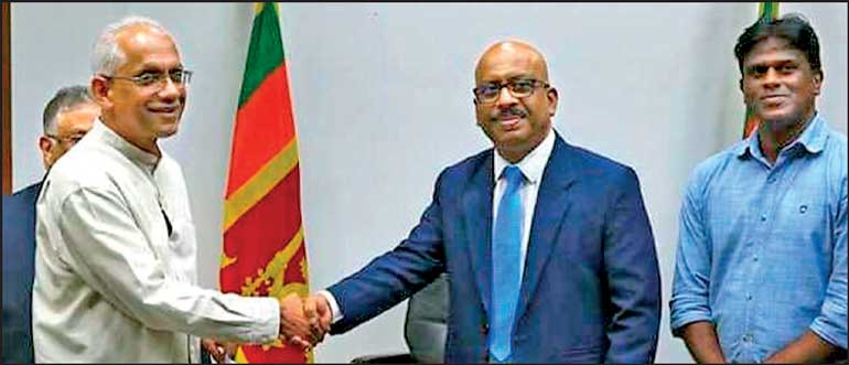 Sports Minister Sunil Kumara Gamage (right) shakes hands with newly appointed SLC Restructuring Committee Chairman Eran Wickramaratne. Deputy Sports Minister Sugath Thilakaratne is also present