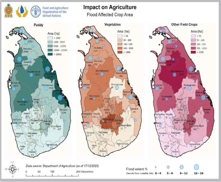 New data from the Department of Agriculture, compiled with FAO support, highlights the scale of flood impacts on agriculture across Sri Lanka. The maps show flood-affected areas of paddy, vegetables, and other field crops, with the most significant damage concentrated in several major agricultural districts.