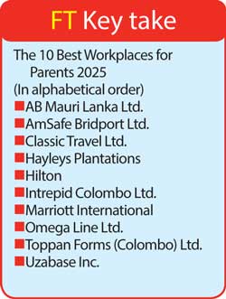 The 10 Best Workplaces for Parents 2025, are AB Mauri Lanka Ltd., AmSafe Bridport Ltd., Classic Travel Ltd., Hayleys Plantations, Hilton, Intrepid Colombo Ltd., Marriott International, Omega Line Ltd., Toppan Forms (Colombo) Ltd., and Uzabase Inc.