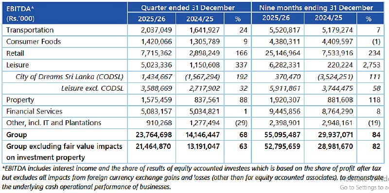 The operationalisation of two of the Group’s largest projects, the City of Dreams Sri Lanka integrated resort and the West Container Terminal (WCT-1) at the Port of Colombo, continued to progress well. “The encouraging quarter-on-quarter momentum demonstrates the strong ramp-up potential of both projects,” he added.
