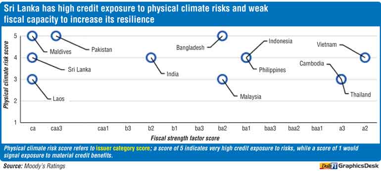 Moody’s places Sri Lanka in a group of highly exposed countries, noting that Sri Lanka, as well as Indonesia (Baa2 stable), the Philippines (Baa2 stable) and Vietnam (Ba2 stable) all have high credit exposure to physical climate risks.