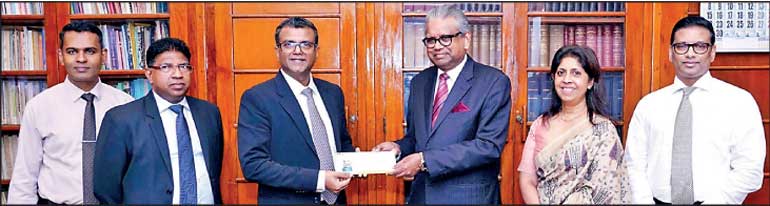 Treasury Secretary Dr. Harshana Suriyapperuma (left) receiving the Rs. 6 billion dividend notice from NSB Chairman Dr. Harsha Cabral, PC. From left: Department of Public Enterprises Director Susantha Ranasinghe, Department of National Budget Director General Jude Nilukshan, NSB General Manager/CEO Shashi Kandambi and Chief Financial Officer Ajith Akmeemana