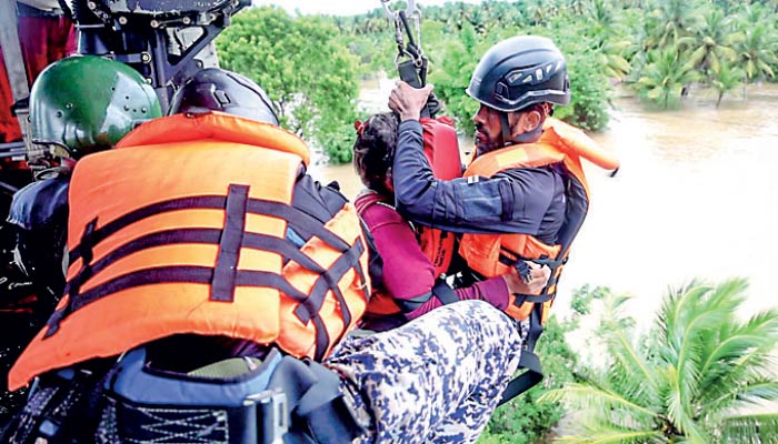 Three people who were trapped in the upper floor of a two-storey house in the Mahawa Ella area, which was affected by the flood caused by the overflow of the Deduru Oya, were rescued yesterday afternoon by a Bell 212 helicopter belonging to the No. 04 Helicopter Squadron of the Sri Lanka Air Force. They were safely rescued and taken to safe places.