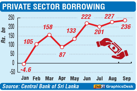 Total private sector borrowings in September spiked to a record Rs. 236.3 billion, resulting in the total outstanding amount reaching Rs. 9.52 trillion, up 22.1% from a year ago.