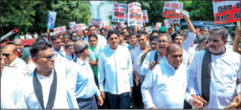 The main Opposition party, Samagi Jana Balawegaya (SJB) yesterday staged a protest near Diyatha Uyana on the Parliament access road in Battaramulla, opposing Government actions. The demonstration led by Opposition Leader Sajith Premadasa was organised to condemn Government actions and specifically target a substandard coal procurement scandal that has triggered a potential no-confidence motion