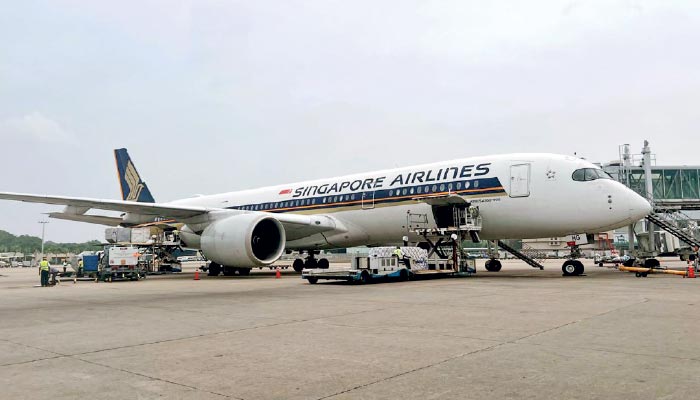 The inaugural daytime flight service by Singapore Airlines arrived at Bandaranaike International Airport yesterday – Pic by T.K.G. Kapila