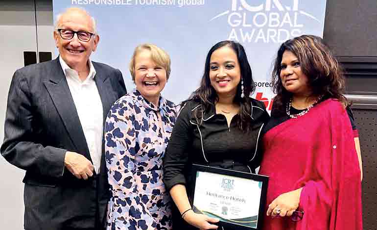 Aitken Spence Hotel Holdings Chairperson Stasshani Jayawardena accepting the Silver award for Heritance Kandalama Hotel at the awards ceremony, flanked by (from left): ICRT Global Board Member Martin Brackenbury, Chairperson Debbie Hindle, and ICRT Sri Lanka Director Charmarie Maelge