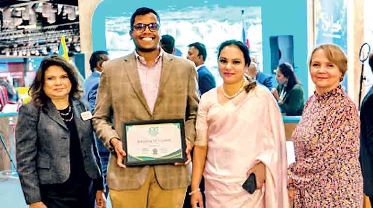 Jetwing Hotels Director – Marketing Hashan Cooray accepting the Jetwing Vil Uyana award at the Sri Lanka stand at the World Travel Market, along with (from left): ICRT Sri Lanka Director Charmarie Maelge, Deputy High Commissioner for Sri Lanka in the United Kingdom Manorie Mallikaratchy, and ICRT Global Chairperson Debbie Hindle
