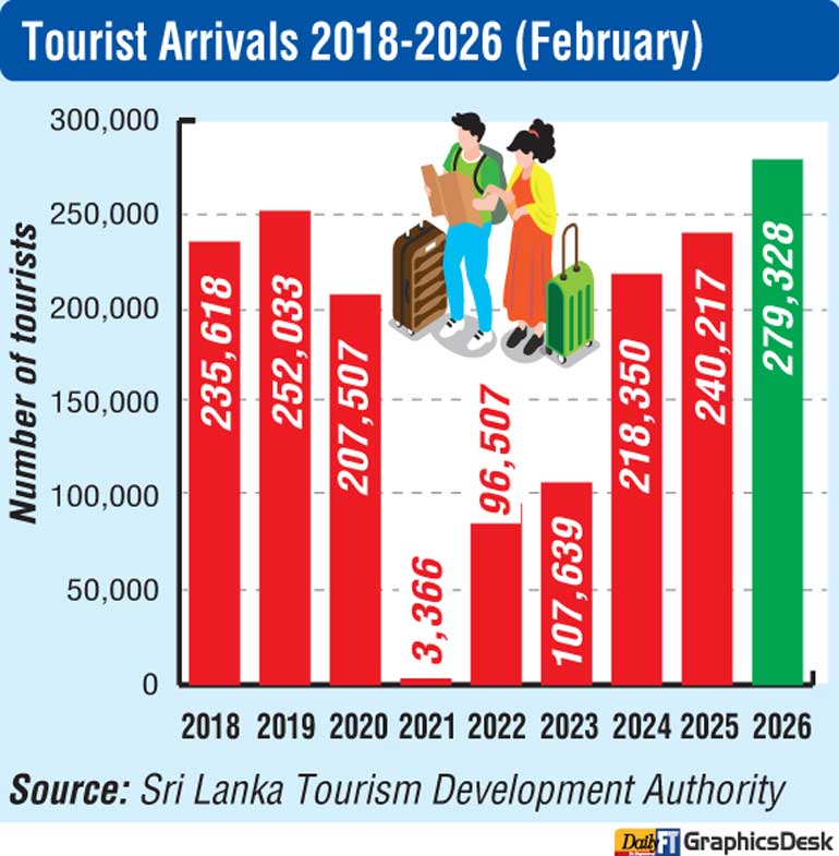 Average daily arrivals during February stood at 9,976 visitors from 8,579 in the same period last year, reflecting sustained demand. The highest single-day inflow for the year so far was recorded on 12 February, when 12,731 tourists arrived ahead of the much-anticipated India–Pakistan T20 clash, including several high-net-worth cricket enthusiasts arriving in Colombo via private jets.