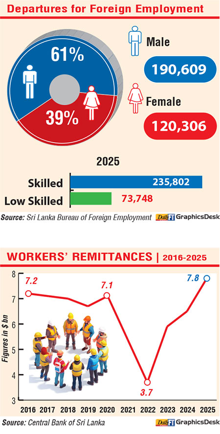 Foreign Affairs and Foreign Employment Deputy Minister Arun Hemachandra said that in 2025, a total of 310,915 skilled and semi-skilled workers left the country for foreign employment, comprising 190,609 men and 120,036 women.